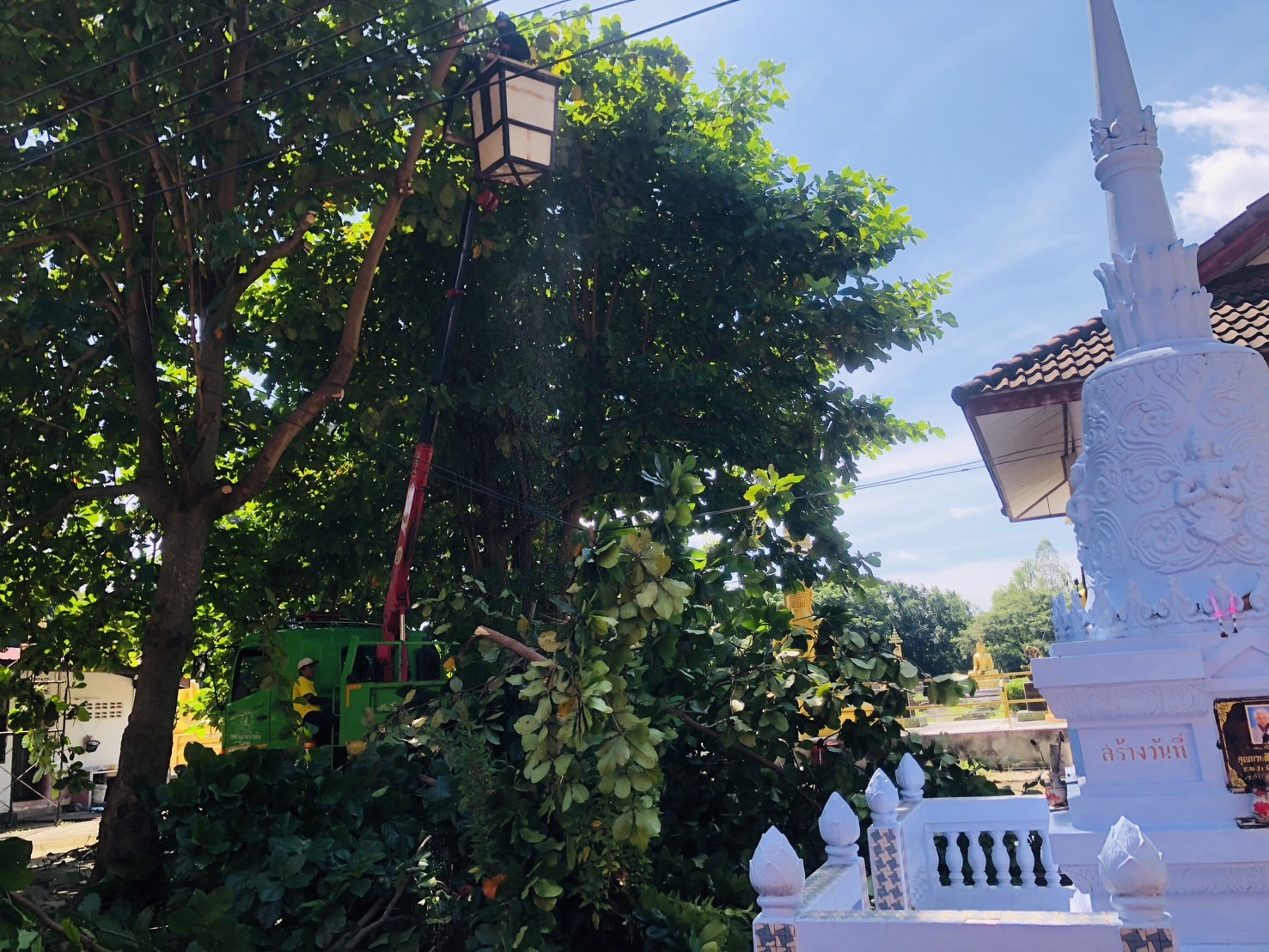 วันที่ 6 ตุลาคม 2568 นายไวพจน์ แสงเสนาะ นายกเทศมนตรีตำบลบ้านผือ มอบหมายให้ นายพายัพ ตะวงษา นักจัดการงานเทศกิจ นำทีมงานป้องกันฯ สำนักปลัดเทศบาล และทีมงานรถเครน กองช่าง ลงพื้นที่วัดอรัญญิกาวาส บ้านศรีสำราญ หมู่ 8 ตัดต้นไม้ที่มีขนาดใหญ่ ซึ่งมีความสูงและแผ่กิ่งก้านปกคลุมอุโบสถ เกรงจะเกิดอันตรายหากเกิดพายุลมแรงทำให้ต้นไม้ล้มทับอุโบสถได้