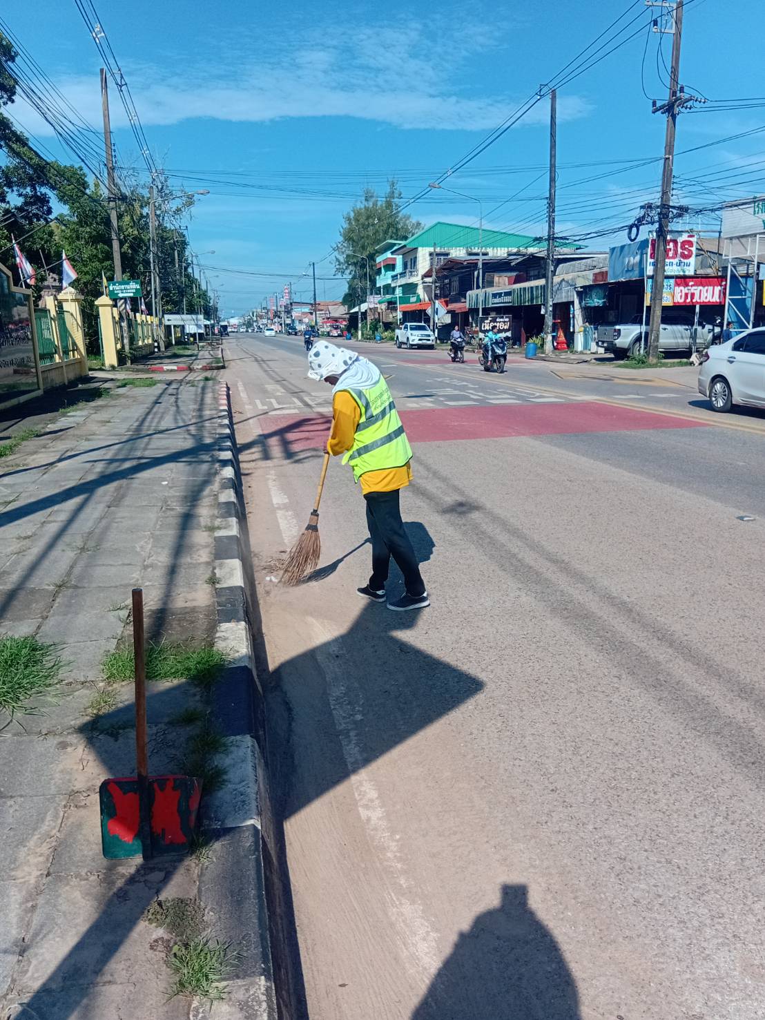 ทีมงานกวาดถนน กองสาธารณสุขและสิ่งแวดล้อม ทำความสะอาดบริเวณถนนชนบทบำรุง ซึ่งเป็นเส้นทางหลักเข้าสู่อำเภอบ้านผือ